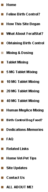 WARNING! This section deals with the mixing and preparation of prescription medicine for feline birth control. If you are not skilled in simple measurements and basic math, then do NOT proceed with mixing your own feline birth control. If you have obtained a prescription for MA from a licensed veterinarian and you are unsure of proper mixing ratios, then consult with your vet to learn about proper mixing of MA. We assume no responsibility for mistakes caused on your part. This information is provided for educational and informational purposes only! |