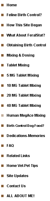Dosing Chart For Feral Colonies Using Generic Liquid MegAce 40 mg Strength Diluted With Distilled Water. Suspension Is Diluted To 5 MG MegAce Per ML (7 Parts Water to 1 Part MegAce)